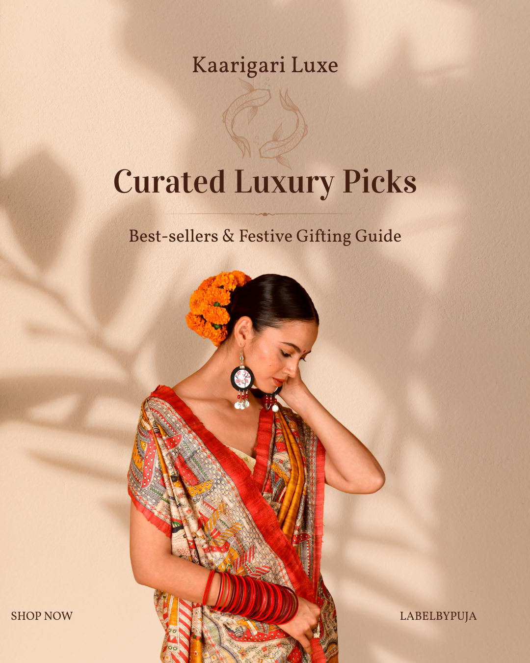 "The traditional elegance of this outfit is breathtaking. The red Bandhani saree paired with the heavily embroidered, full-sleeved blouse is a masterpiece. I especially loved the contemporary edge the black and gold choker added to the classic look. LabelByPuja truly understands how to balance tradition and modern style. The quality of the stitching and the richness of the fabric are top-notch."