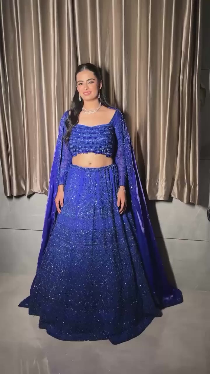 "My experience getting this royal blue lehenga custom-made was fantastic. I wanted a modern silhouette with a stunning color for a sangeet, and the final piece exceeded my expectations! The beadwork on the choli is incredibly detailed, and the subtle shimmer on the lehenga skirt catches the light beautifully. The flowing cape-dupatta was the perfect, dramatic addition. I couldn't stop twirling!"