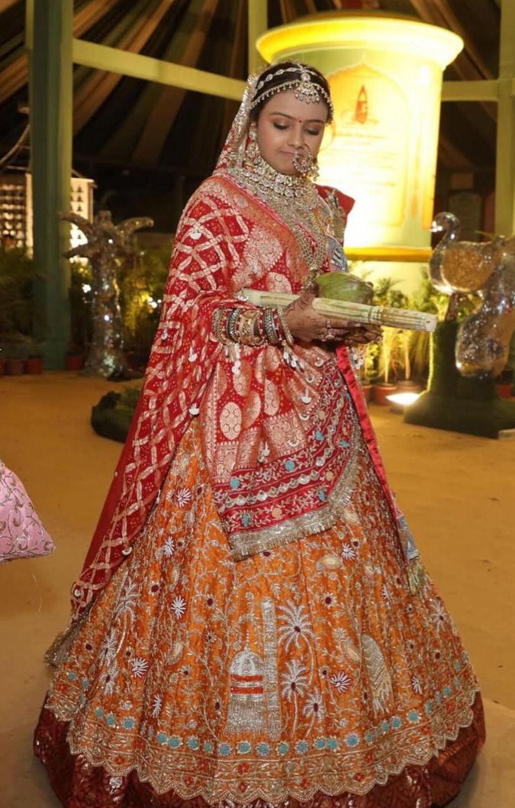 The rich red and orange tones felt auspicious, and the intricate hand-embroidery on the lehenga was simply divine, telling a story of tradition. The care taken with the bandhani dupatta and the perfect drape ensured I felt enveloped in grace and tradition throughout the ceremony. The outfit was not just clothing; it was a part of my spiritual journey. I am forever grateful for their meticulous work in crafting a piece worthy of such a sacred occasion."